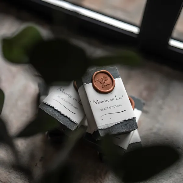 Onze luxe trouwbedankjes van zeep zijn volledig gepersonaliseerd en maken jullie trouwdag nog specialer. Wij creëren zeepbedankjes voor jullie bruiloft met een elegante uitstraling, uniek vormgegeven en volledig afgestemd op de stijl en sfeer van jullie trouwdag en huwelijksuitnodiging. Perfect voor bruidsparen die oog hebben voor detail, iets unieks willen geven en houden van rust, stijl en kwaliteit. Waarom luxe en gepersonaliseerde zeepjes als attentie? Hun elegante uitstraling en geur brengen je geliefde gasten in herinnering nog vaak terug naar jullie dag van je leven!