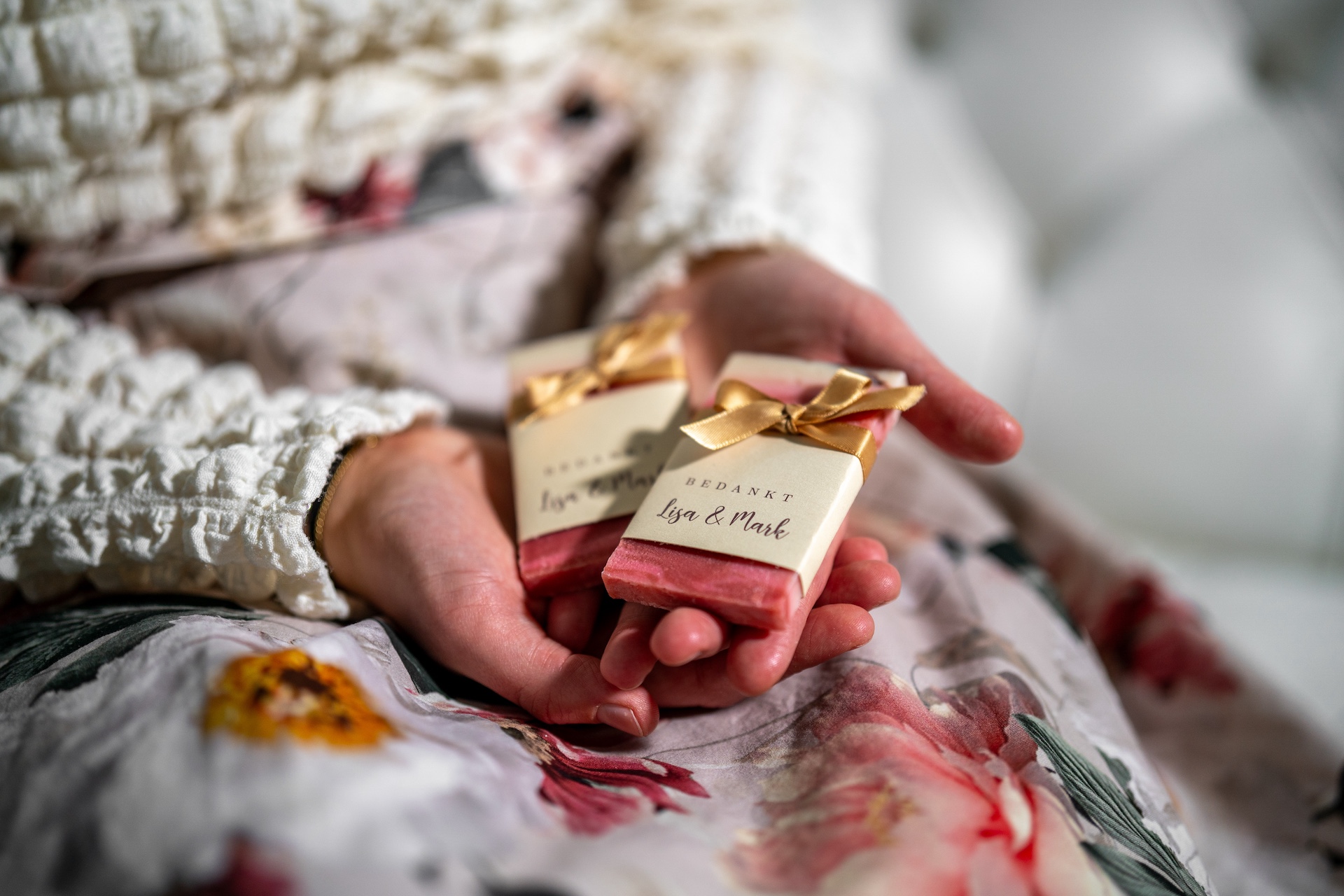 Ieder bedankje wordt persoonlijk afgestemd op jullie trouwstijl, thema en wensen. Zo creëren wij een uniek en elegant trouwbedankje in de vorm van een luxe zeepje dat perfect past bij jullie bijzondere dag en dat je niet overal tegenkomt.